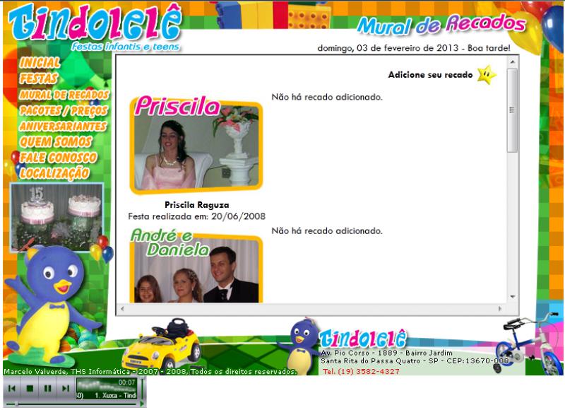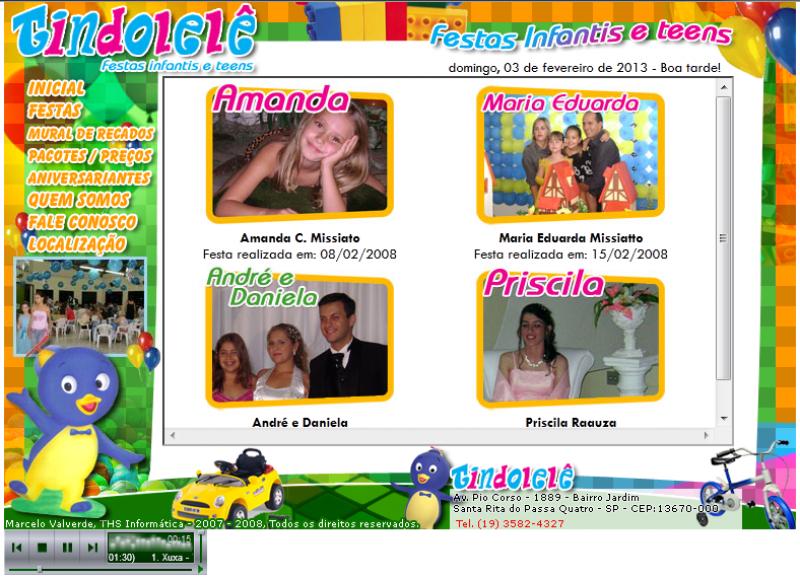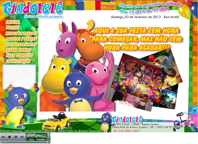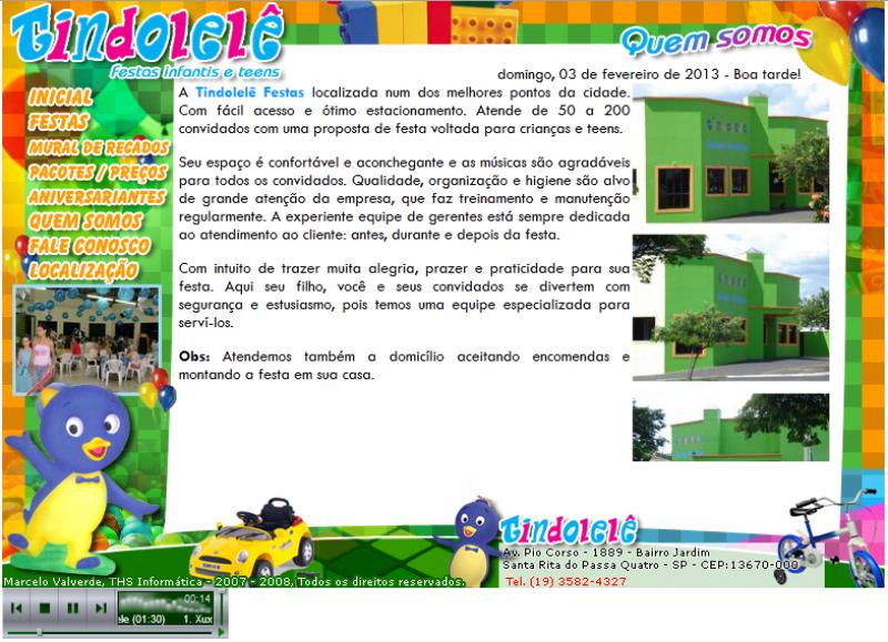 O website Tindolelê Festas possui uma lista de festas realizadas e com suas fotos, havia um sistema de mural de recados para que os visitantes deixassem seus recados sobre a festa, apresentava vários pacotes e preços das festas, possuía a lista de aniversariantes do mês. Além disso, um formulário de contato, localização com animação em flash e ainda um web player que tocava alguns trechos das músicas infantis.